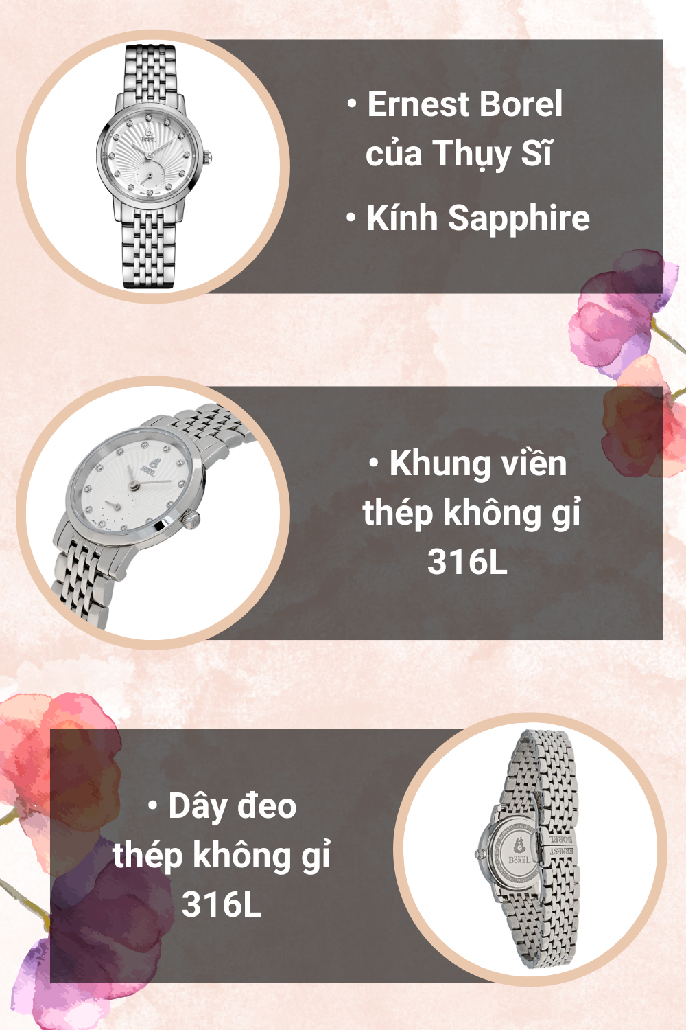 - Đồng hồ Ernest Borel là một thương hiệu đến từ Thụy Sĩ, có thiết kế sang trọng, tinh tế mang lại vẻ nữ tính, nhẹ nhàng cho phái đẹp