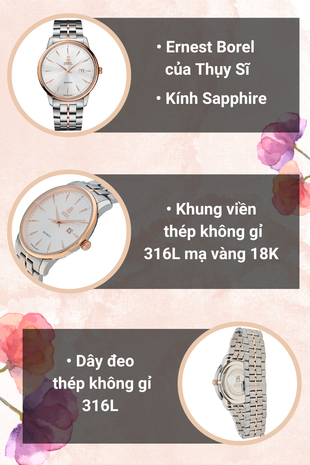 - Ernest Borel được biết tới là thương hiệu đồng hồ dành riêng cho các cặp đôi. Với thiết kế lãng mạn và tinh xảo, những chiếc đồng hồ Ernest Borel chắc hẳn sẽ rất phù hợp để làm món quà tình yêu dành tặng cho nửa kia của mình.