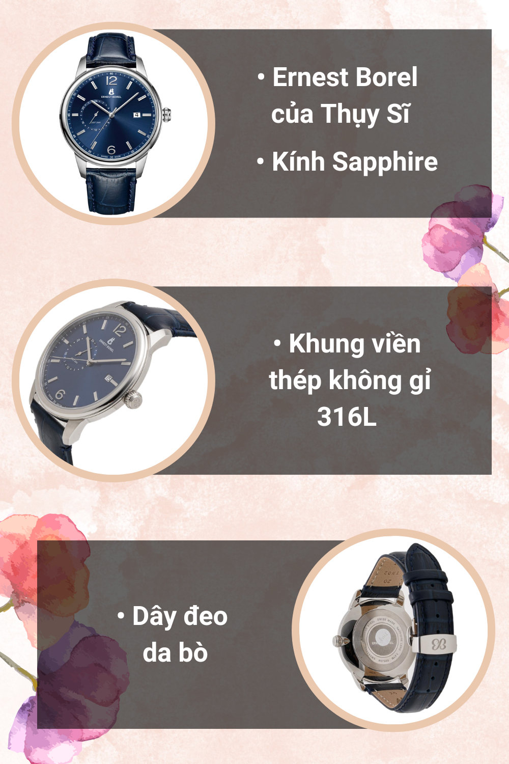 - Nổi tiếng với những thiết kế vừa sang trọng, lịch lãm lại không thể thiếu sự lãng mạn, mỗi chiếc đồng hồ của Ernest Borel đều được đầu tư từ từng chiếc kim, dây đeo cho đến mặt đồng hồ.