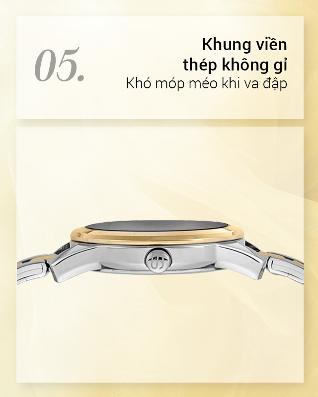 - Thép không gỉ cho khả năng chịu lực tốt, chống oxy hóa, bền bỉ theo thời gian là chất liệu của khung viền và dây đeo