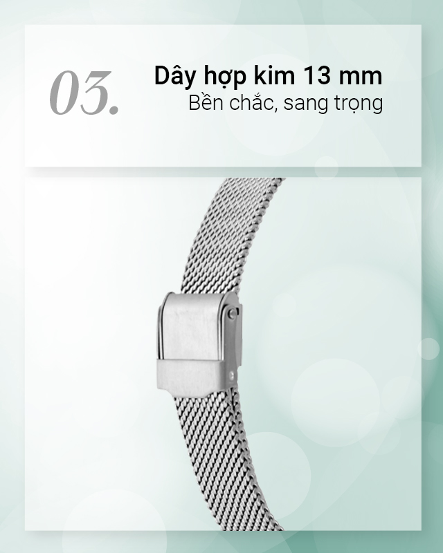 - Đồng hồ có đường kính mặt 32 mm và độ rộng dây 13 mm