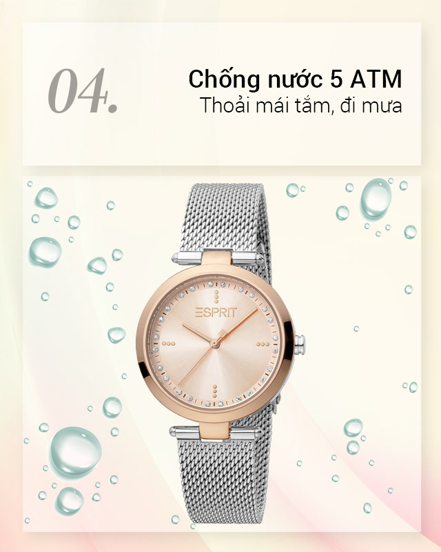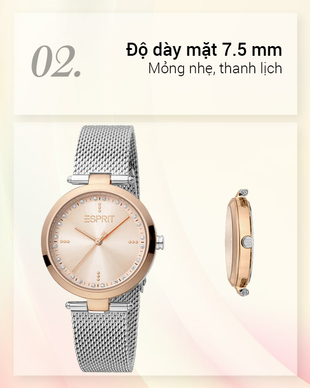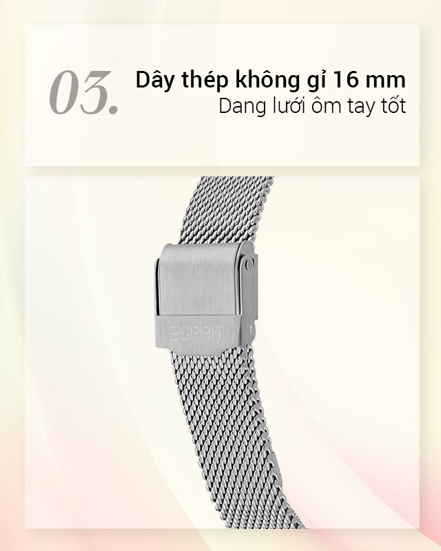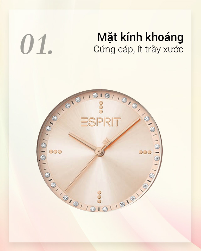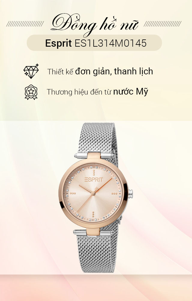 - Thiết kế nổi bật, kiểu dáng sang trọng dành cho các quý cô thời thượng, sản phẩm đến từ hãng đồng hồ Esprit, thương hiệu chất lượng của Mỹ