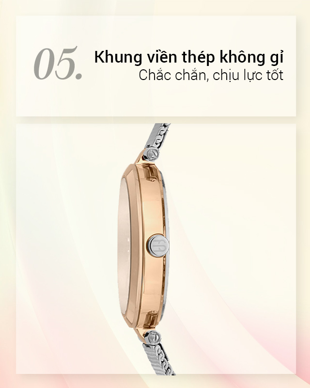 - Thép không gỉ cho khả năng chịu lực tốt, chống oxy hóa giúp đồng hồ nữ luôn giữ được độ sáng bóng là chất liệu của khung viền và dây đeo