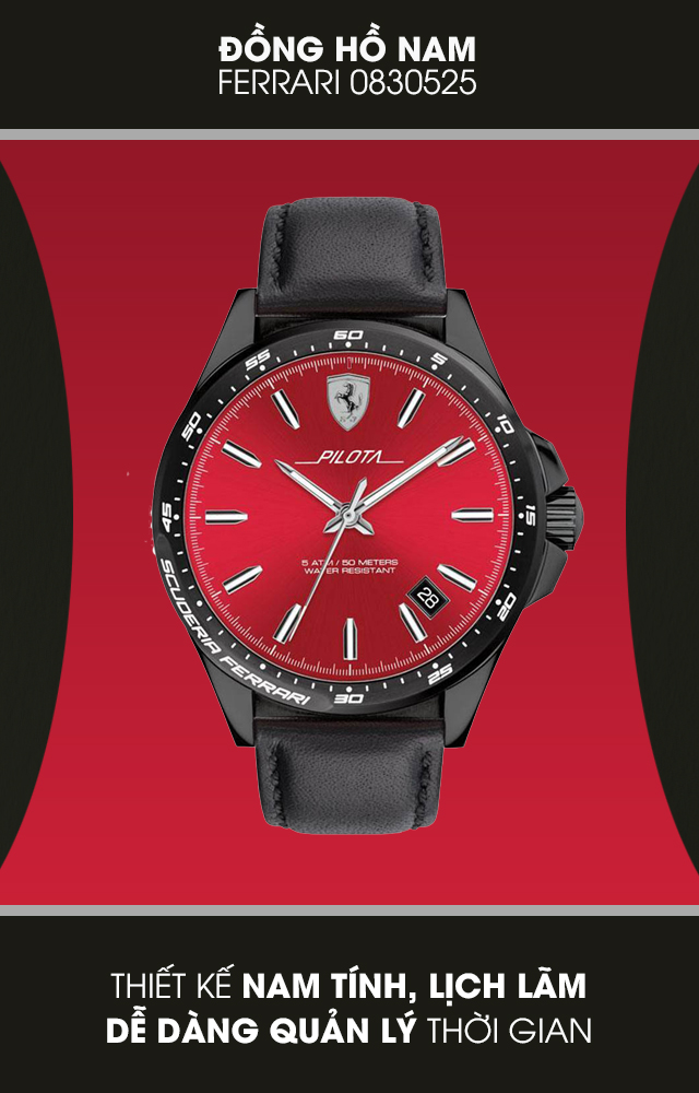- Thiết kế ấn tượng, mạnh mẽ, đẳng cấp, lấy cảm hứng từ những siêu xe của họ, đồng hồ Ferrari là bộ sưu tập không thể thiếu đối với những bạn trẻ có niềm đam mê về tốc độ. Tất cả các quá trình làm nên chiếc đồng hồ từ thiết kế có đến lắp ráp đều được hãng theo dõi gắt gao để mang đến người dùng một sản phẩm chỉnh chu và hoàn thiện nhất đến từng chi tiết.
