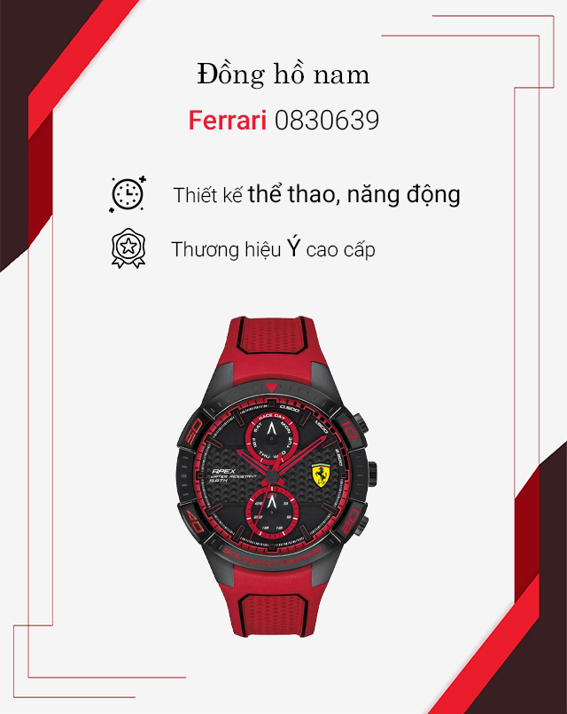 - Thiết kế ấn tượng, mạnh mẽ, đẳng cấp, lấy cảm hứng từ những siêu xe của họ, đồng hồ Ferrari là bộ sưu tập không thể thiếu đối với những bạn trẻ có niềm đam mê về tốc độ. Tất cả các quá trình làm nên chiếc đồng hồ từ thiết kế có đến lắp ráp đều được hãng theo dõi gắt gao để mang đến người dùng một sản phẩm chỉnh chu và hoàn thiện nhất đến từng chi tiết.