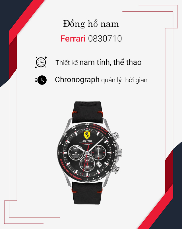 - Thiết kế ấn tượng, mạnh mẽ, đẳng cấp, lấy cảm hứng từ những siêu xe của họ, đồng hồ Ferrari là bộ sưu tập không thể thiếu đối với những bạn trẻ có niềm đam mê về tốc độ. Tất cả các quá trình làm nên chiếc đồng hồ từ thiết kế có đến lắp ráp đều được hãng theo dõi gắt gao để mang đến người dùng một sản phẩm chỉnh chu và hoàn thiện nhất đến từng chi tiết.