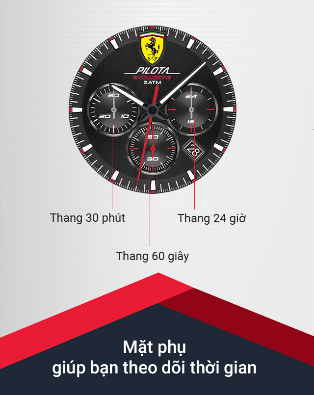- Sản phẩm sở hữu phong cách thể thao, nam tính cùng tông màu đen đỏ mạnh mẽ, đến từ hãng đồng hồ Ferrari, thương hiệu uy tín của Ý
