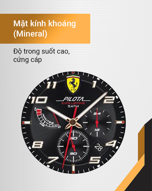 - Kính khoáng (Mineral) cho độ trong suốt tốt, cứng cáp, bảo vệ mặt đồng hồ có đường kính là 44 mm