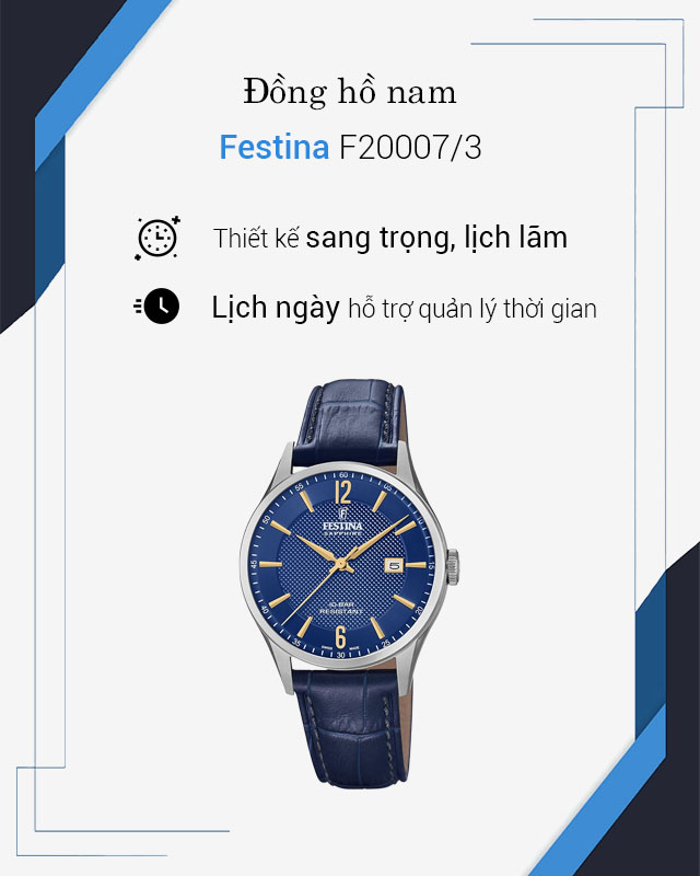 Tổng quan về Đồng hồ Nam Festina F20007/3Đồng hồ Nam Festina F20007/3 có mặt kính Sapphire cao cấpĐồng hồ Nam Festina F20007/3 có độ dày mặt 10 mmĐồng hồ Nam Festina F20007/3 sở hữu khung viền bằng thép không gỉ 316L chắc chắnĐồng hồ Nam Festina F20007/3 có dây da êm nhẹ, ôm tay tốtĐồng hồ Nam Festina F20007/3 sở hữu khả năng chống nước 10 ATMĐồng hồ Nam Festina F20007/3 được trang bị thêm tính năng lịch ngày tiện lợi