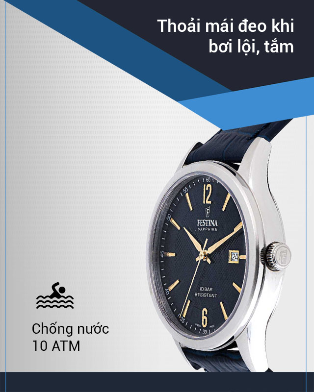 - Chỉ số chống nước 10 ATM: Thoải mái đeo đồng hồ khi bơi, tắm mà không lo vào nước, không mang khi lặn
