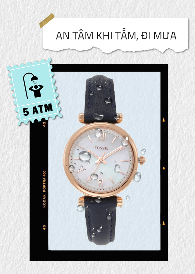 - Hệ số chống nước 5 ATM: Người dùng thoải mái đeo đồng hồ khi tắm, đi mưa, không mang khi bơi, lặn