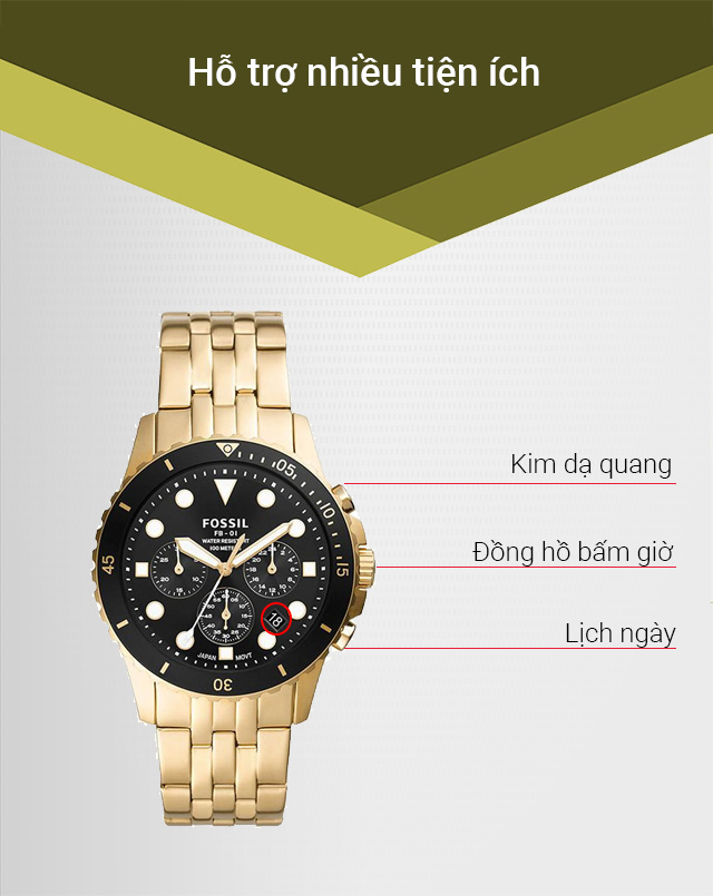 - Được trang bị thêm các tiện ích như: kim dạ quang, bấm giờ thể thao và ô lịch ngày, cho bạn thêm thuận tiện