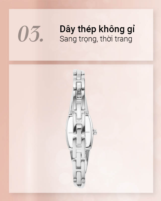 - Đồng hồ nữ bền bỉ nhờ dây đeo và khung viền làm từ thép không gỉ, chịu lực tốt, chống gỉ sét, sáng bóng trước mọi thời tiết
