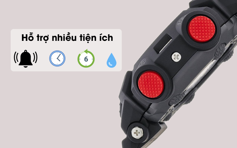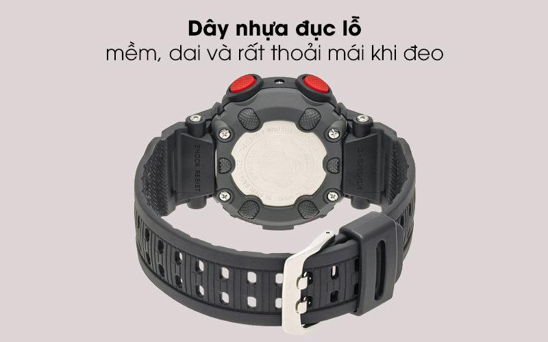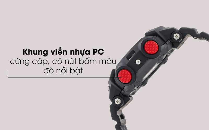 Khung viền được làm từ nhựa PC có khả năng chống va đập tốt, bảo vệ kết cấu đồng hồ an toàn hơn. Kết hợp với các nút bấm màu đỏ nổi bật, gây ấn tượng mạnh khi nhìn vào đồng hồ.