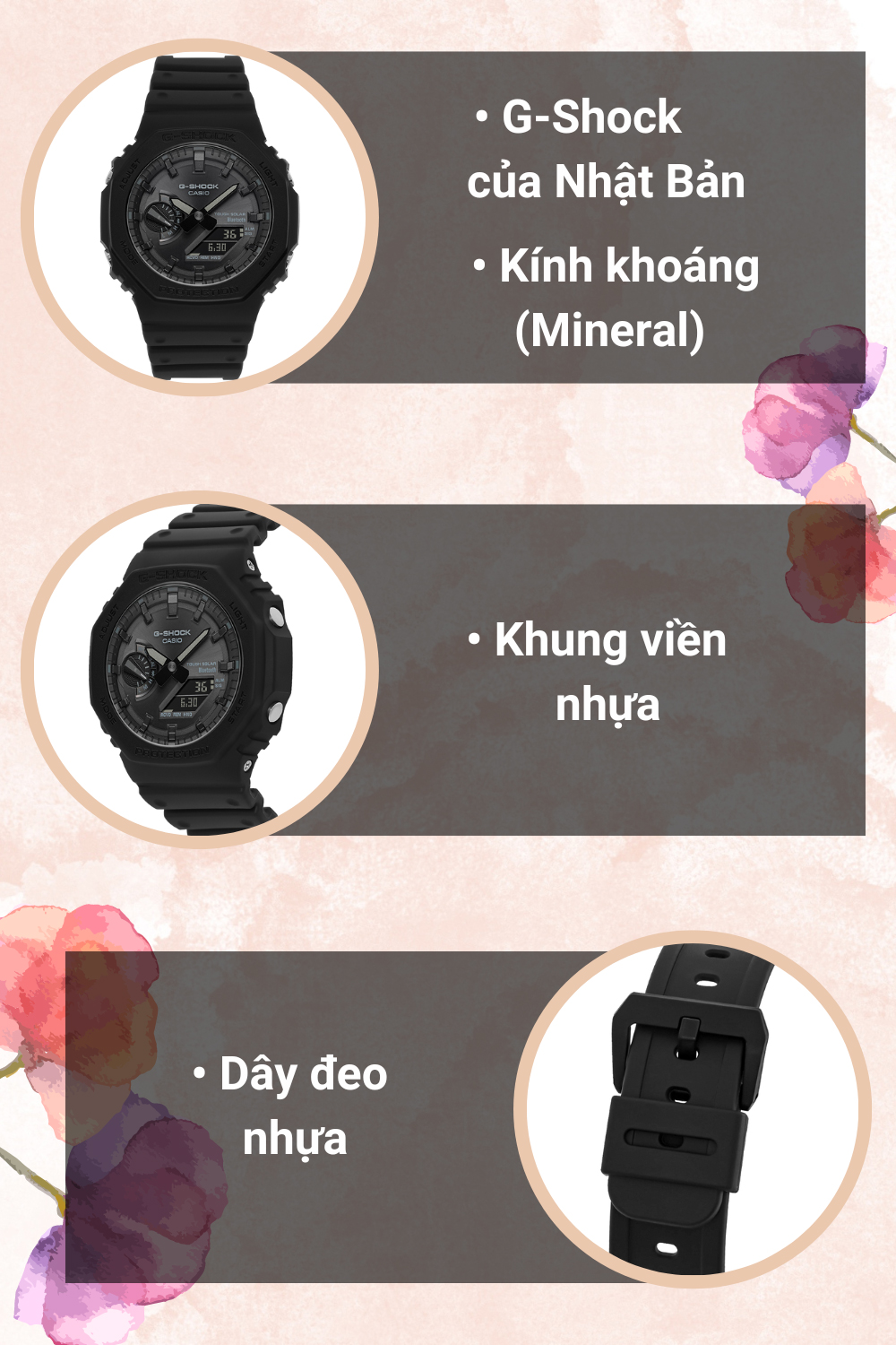 • Khung viền của đồng hồ kim - điện tử từ nhựa chắc chắn kết hợp dây đeo nhẹ nhàng, độ bền cao, thiết kế đục lỗ phù hợp với nhiều kích cỡ cổ tay.