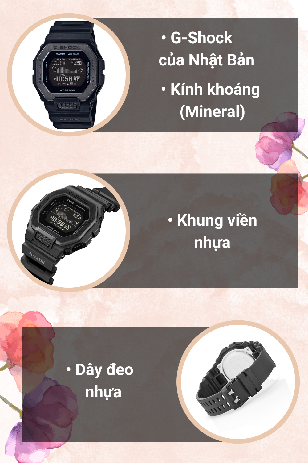 - Bộ đôi khung viền và dây đeo của đồng hồ được làm từ nhựa cho khả năng chống thấm nước tốt, trọng lượng nhẹ