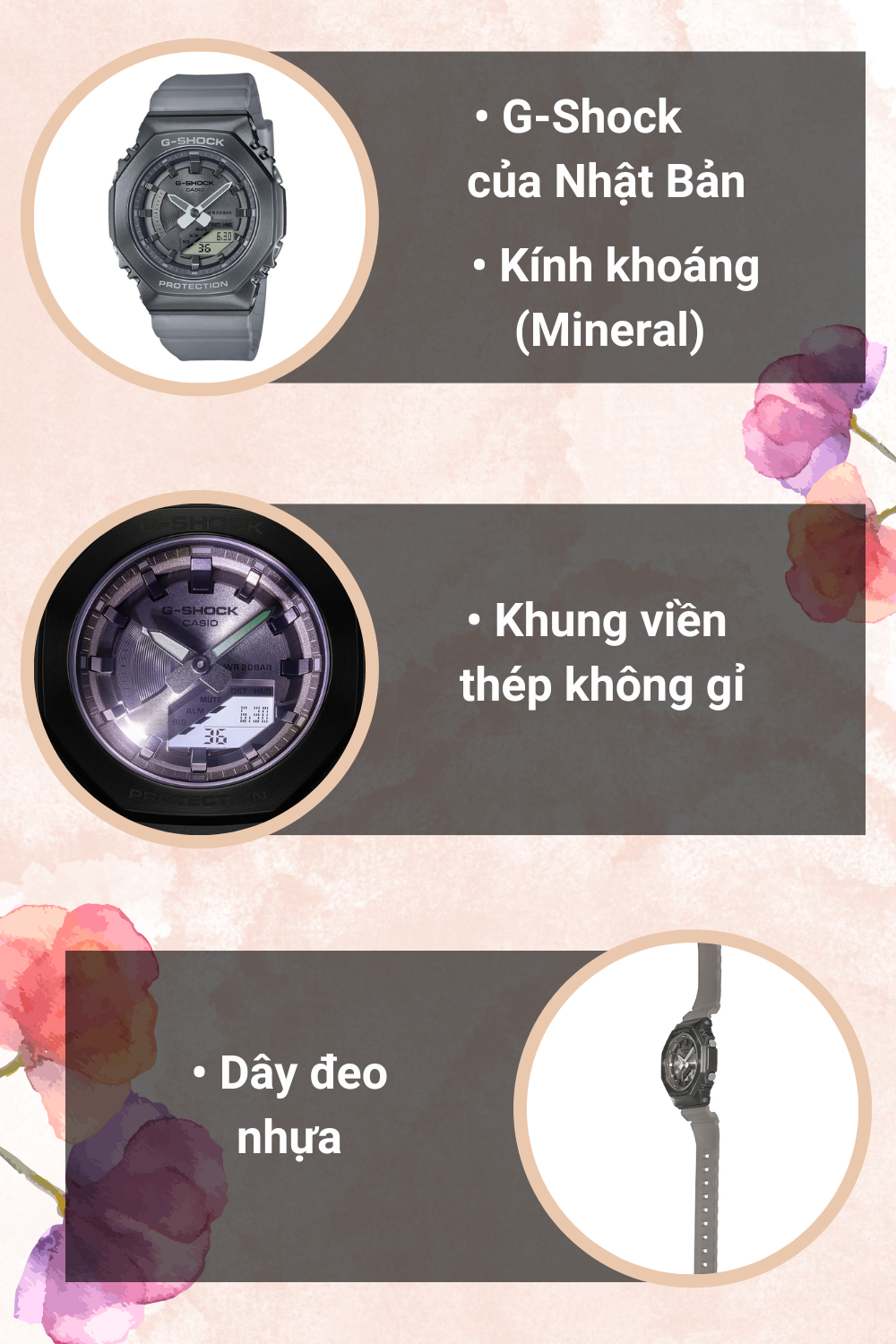 Khung viền của đồng hồ làm từ thép không gỉ - chắc chắn và sáng bóng, hạn chế trầy xước.