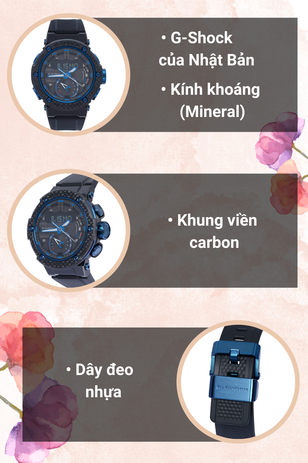 • Đồng hồ G-SHOCK 46.5 mm Nam GST-B200X-1A2DR có khung viền được làm từ carbon và dây đeo đều được làm từ nhựa bền bỉ, chống nước tốt.