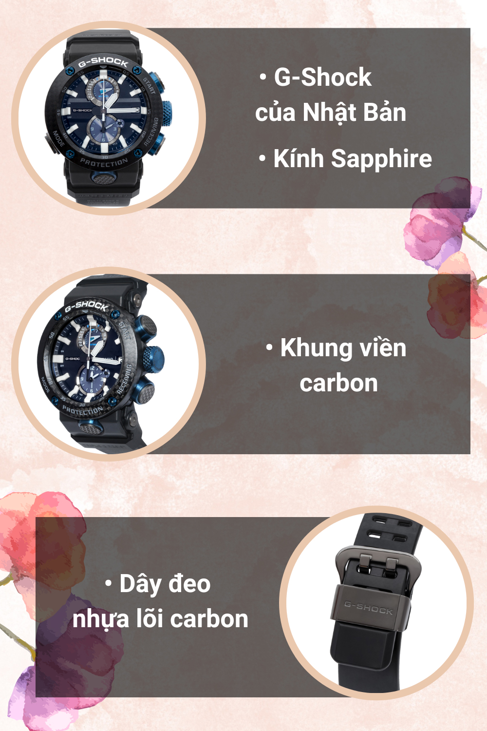 • Dây đeo được làm từ chất liệu nhựa lõi carbon không chỉ đem đến độ bền tối ưu, mà còn mang lại cảm giác thoải mái khi và dễ dàng điều chỉnh kích thước phù hợp với cổ tay. Khung viền được làm từ carbon bền bỉ với thời gian.