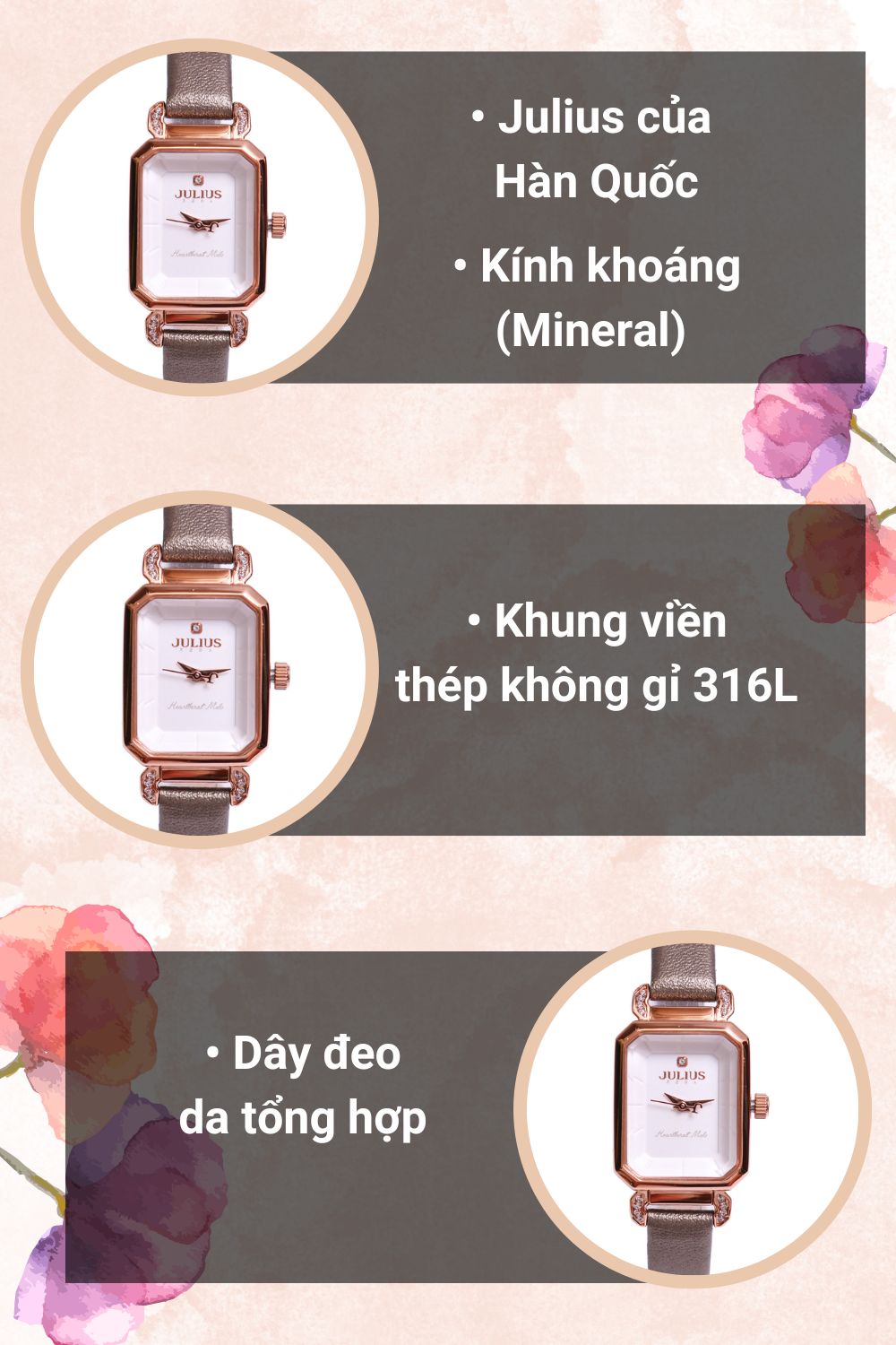 • Kích thước đường kính của đồng hồ này là 21 x 38 mm, phù hợp với cổ tay của phụ nữ có kích thước từ nhỏ đến trung bình. Ngoài ra, Julius sử dụng kính khoáng chất lượng, giúp hạn chế trầy xước và bảo vệ khỏi va đập thông thường, cho phép người dùng thoải mái sử dụng đồng hồ trong nhiều hoạt động mà không cần lo lắng.