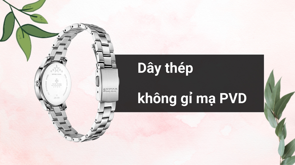 • Thiết kế dây đeo được làm từ thép không gỉ có trang bị mắc cài mạ PVD không chỉ giúp tăng độ bóng bẩy mà còn mang đến cảm giác thoải mái khi mang vào tay. Ngoài ra, phần khung viền của đồng hồ này cũng làm từ cùng chất liệu, có tính năng chống chịu va đập và ăn mòn tốt, mang lại vẻ đẹp sang trọng và sự bền bỉ theo thời gian cho sản phẩm.