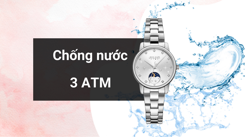 • Đồng hồ Julius có chỉ số kháng nước 3 ATM, cho phép bạn sử dụng trong các hoạt động thông thường như rửa tay hay đi bộ dưới mưa nhẹ. Lưu ý: không nên đeo khi đi tắm hoặc bơi lội để đảm bảo sự an toàn cho sản phẩm.