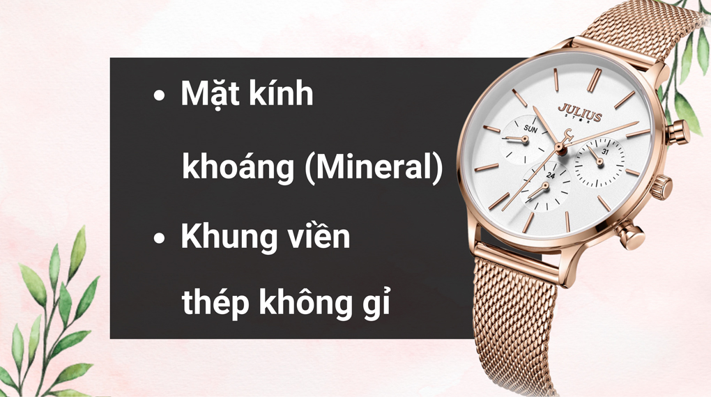 • Kích thước đường kính mặt 35 mm của mẫu đồng hồ Julius này được đánh giá là phù hợp với các bạn nữ có cổ tay trung bình đến lớn, mang lại vẻ đẹp hài hòa và cân đối. Thương hiệu đã sử dụng chất liệu kính khoáng là vật liệu mà hãng dùng để chế tác mặt kính, có đặc tính cứng cáp bền bỉ trước các va đập vừa phải giúp các bạn có thể yên tâm khi sử dụng thường xuyên.
