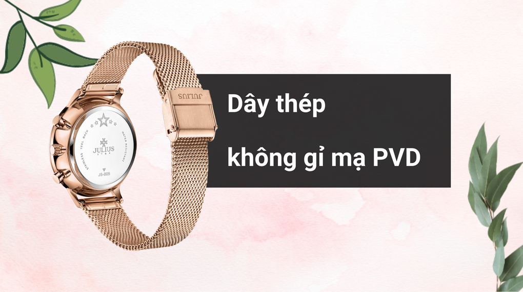 • Với vật liệu chế tạo từ thép không gỉ, khung viền và dây đeo của sản phẩm có khả năng chịu được sự va đập và độ bền cao hơn so với các loại kim loại khác. Hơn nữa, chất liệu này cũng giúp hạn chế tình trạng ăn mòn, giúp cho các quý cô có thể yên tâm sử dụng sản phẩm thường xuyên. Đặc biệt, dây đeo của sản phẩm được sử dụng công nghệ mạ PVD tiên tiến kết hợp với chất liệu là thép không gỉ giúp tăng độ bóng bẩy và độ bền lên đến 2 hoặc 3 lần so với các mẫu đồng hồ thông thường.