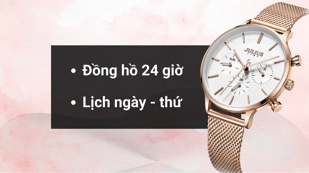 • Julius là một thương hiệu thời trang đến từ Hàn Quốc, được đông đảo người hâm mộ yêu thích bởi thiết kế độc đáo và đa dạng, giúp phối đồ dễ dàng. Mẫu đồng hồ Nữ Julius Star 35 mm Nữ JS-005C của thương hiệu này có một gam màu chính cùng với thiết kế độc đáo. Kiểu dáng đồng hồ 6 kim vốn đã quen thuộc trên những chiếc đồng hồ đa chức năng phối hợp với phần vỏ núm màu tạo nên thiết kế đơn giản mà vẫn thanh lịch, trẻ trung. Sản phẩm sẽ là món phụ kiện phù hợp với các quý cô sang trọng, theo đuổi phong cách nữ tính và muốn tạo sự ấn tượng tốt với đối phương khi gặp mặt.