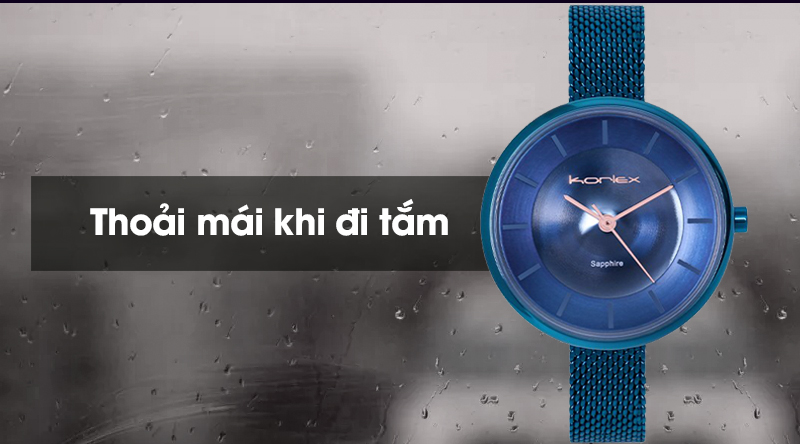 Với thông số chống nước 5 ATM, người dùng yên tâm đeo lúc tắm hay đi mưa, tuy nhiên không nên đeo chiếc đồng hồ Korlex này khi bơi lội