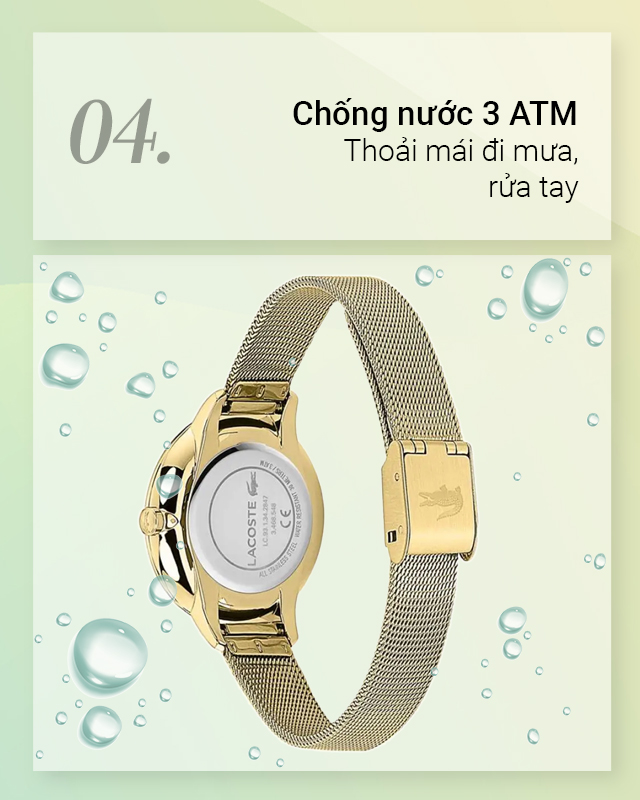 - Hệ số chống nước là 3 ATM nên người đeo hoàn toàn yên tâm đeo khi đi mưa và rửa tay. Tuy nhiên, không nên đeo khi đi tắm, bơi lội