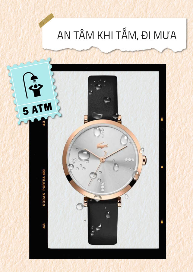 - Mẫu đồng hồ nữ này có hệ số chống nước là 5 ATM nên hoàn toàn yên tâm đeo khi tắm, đi mưa và rửa tay. Tuy nhiên, không nên đeo khi bơi lội