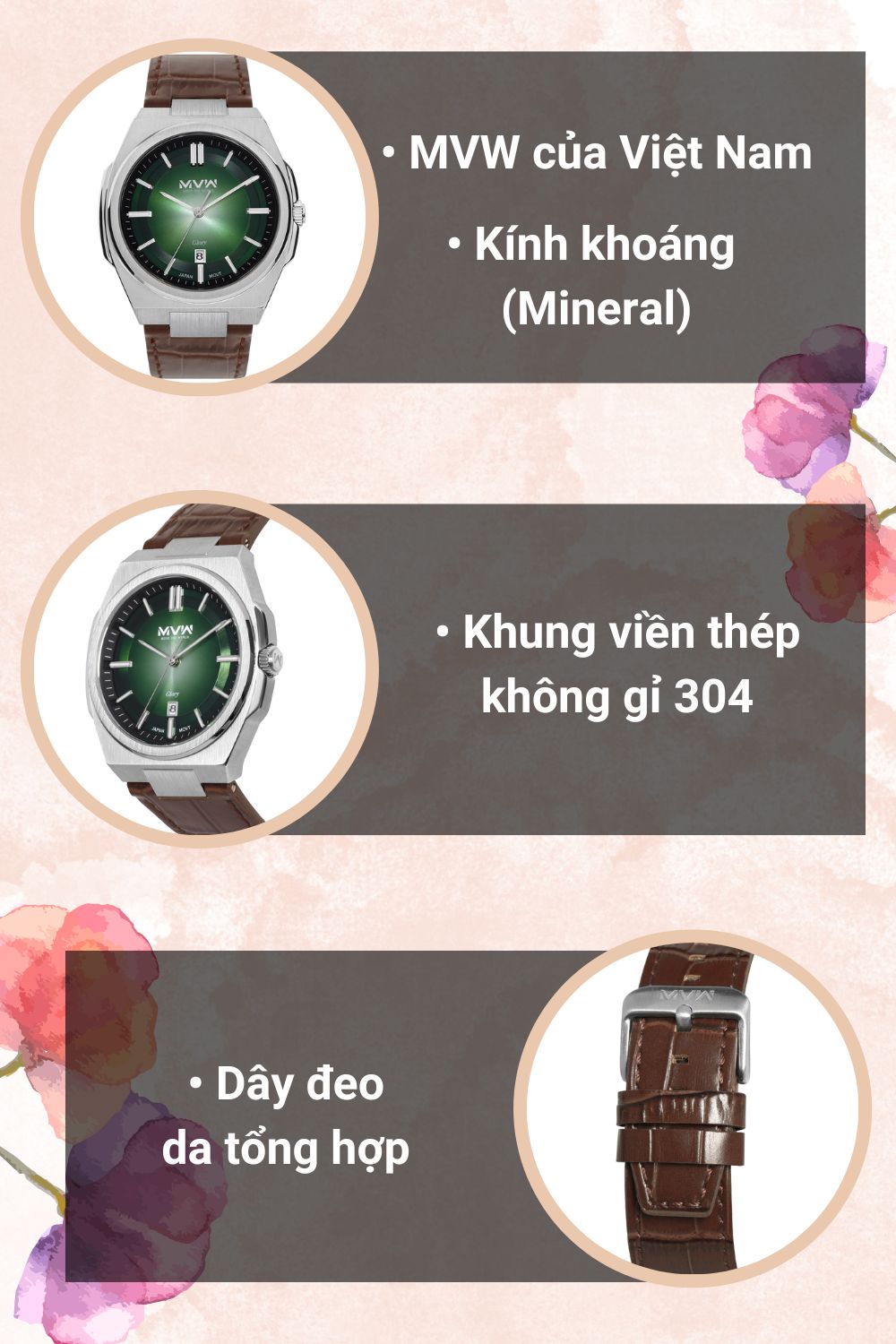 • Đồng hồ nam này được thiết kế với đường kính mặt đáp ứng nhu cầu của các bạn nam có cổ tay vừa, với kích thước 43 mm. MVW sử dụng chất liệu kính khoáng cho phần mặt kính, có thể chịu được trầy xước ở mức vừa phải trên mặt đồng hồ.