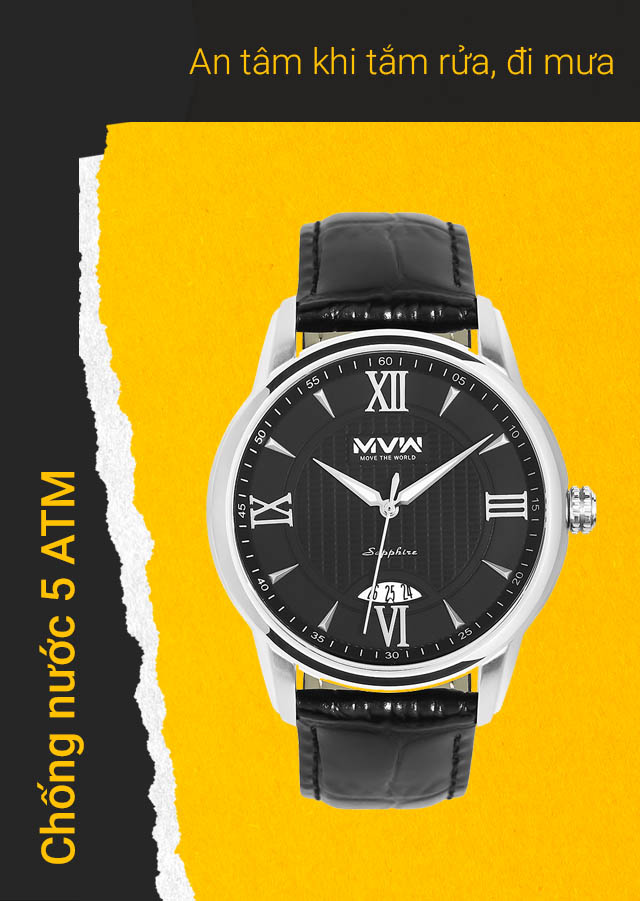 - Hệ số chống nước 5 ATM giúp bạn không cần tháo đồng hồ nam này khi tắm, rửa tay và đi mưa, không nên đeo khi đang đi bơi