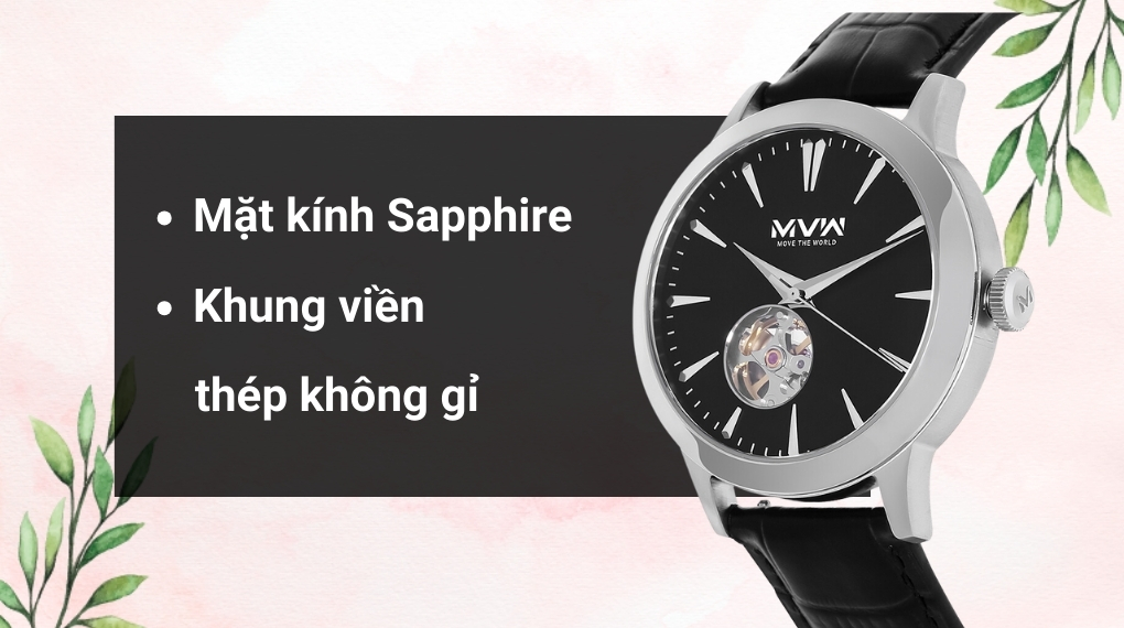 Đồng hồ MVW với đường kính mặt 41 mm sẽ là một lựa chọn hoàn hảo cho những chàng trai có cổ tay vừa hoặc nhỏ. Kích thước này vừa đủ để tạo điểm nhấn cho cổ tay, nhưng cũng không quá lớn để gây khó chịu khi đeo. Sản phẩm còn được trang bị mặt kính Sapphire cao cấp, có độ cứng cao, khả năng chịu va đập tốt cùng độ trong suốt tuyệt vời, giúp người đeo dễ dàng quan sát giờ giấc.