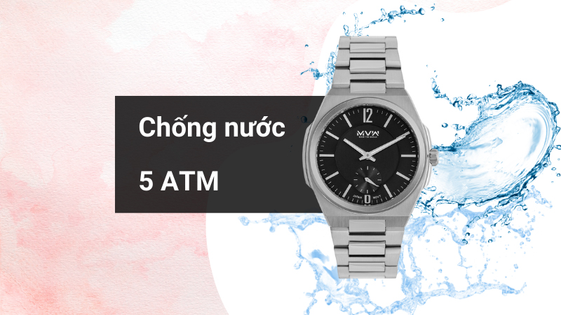 • 5 ATM là độ kháng nước của chiếc đồng hồ nam này, người dùng có thể an toàn đeo khi đi mưa, đi tắm. Lưu ý: không nên mang khi đi bơi hay lặn.