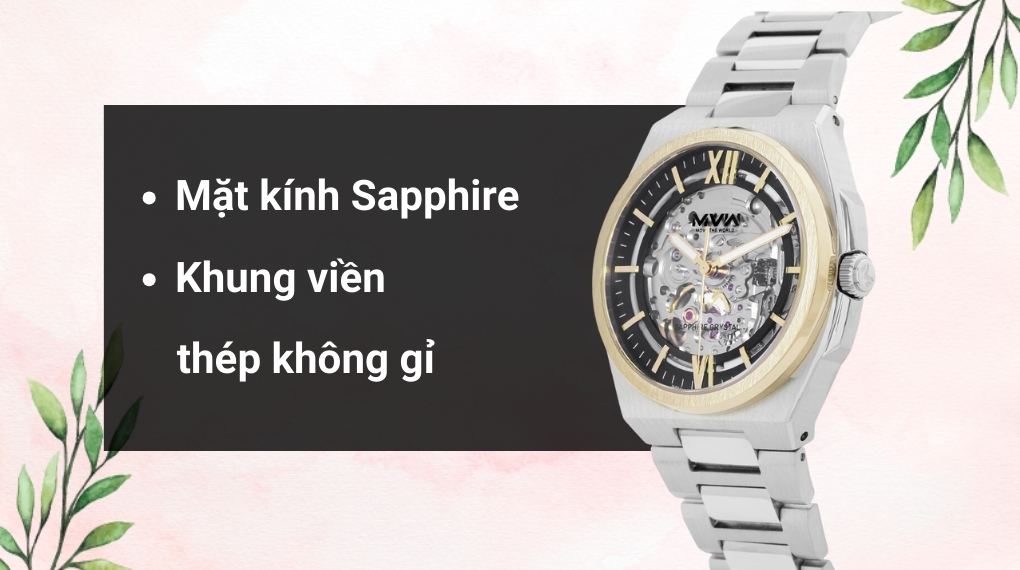• 43 mm là đường kính mặt của đồng hồ MVW này, một kích thước vừa vặn và cân đối, có thể đem lại vẻ đẹp đẳng cấp cho cổ tay người đeo. Bên cạnh đó, mặt kính còn được làm từ chất liệu kính Sapphire trong suốt, cứng cáp có thể bảo vệ mặt đồng hồ khỏi những va đập nhẹ, mang đến một mặt kính bền bỉ và sáng bóng.