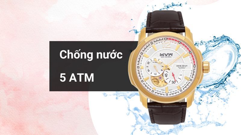 • 5 ATM là hệ số chống nước của mẫu đồng hồ MVW STAR 40 mm Nam MLA006-01, bạn thoải mái đeo khi tắm, rửa tay hay đi mưa, không mang khi bơi, lặn.