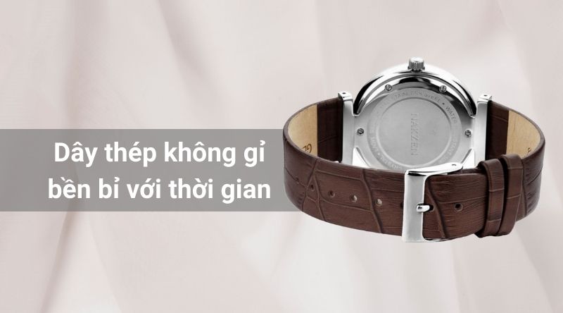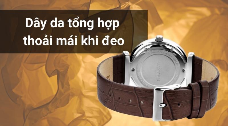 - Chất liệu dây da tổng hợp nên khi đeo tạo cảm giác mềm mại và thoáng mát trong ngày dài, dễ lau chùi và độ bền cao. Khung viền làm bằng thép không gỉ, độ bền cao, chống ăn mòn và trầy xước. Bề mặt thép được gia công theo hai dạng bóng mờ và bóng sáng, điều này tạo nên sự đặc biệt, giúp các chi tiết của đồng hồ tinh tế hơn.