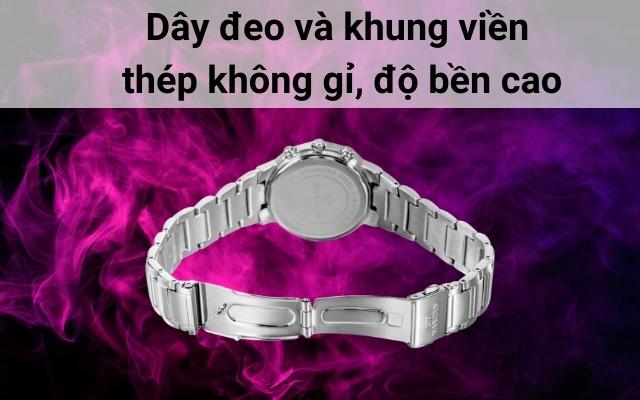 - Đồng hồ có khung viền và dây đeo làm bằng thép không gỉ, độ cứng cao. Hạn chế được trầy xước khi va chạm.