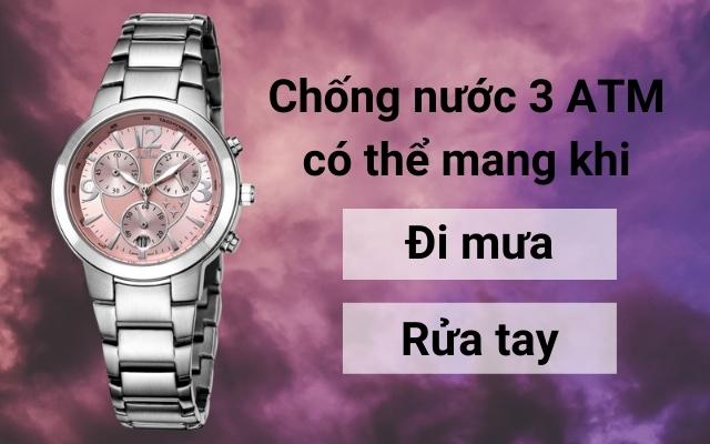 - Mẫu đồng hồ nữ này có độ kháng nước 3 ATM. Có thể mang khi rửa tay và đi dưới trời mưa nhỏ. Lưu ý không sử dụng đồng hồ khi đi bơi, lặn, đi tắm.