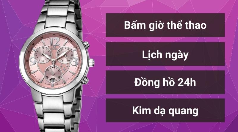 - Tiện lợi với tiện ích bấm giờ thể thao, lịch ngày, đồng hồ 24h và kim dạ quang giúp người dùng theo dõi thời gian một cách thuận tiện.