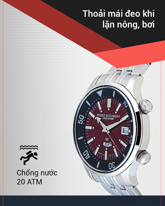 - Hệ số chống nước 20 ATM: Đồng hồ vẫn an toàn ngay cả khi bạn đeo đi lặn, bơi