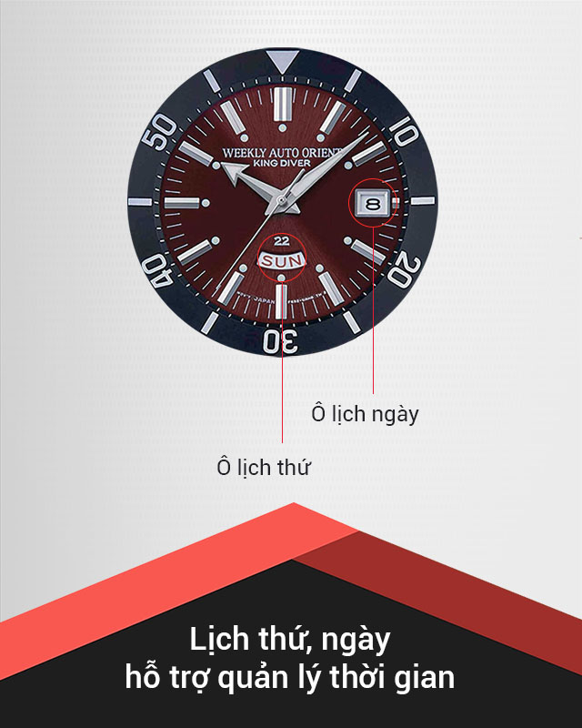 - Đồng hồ được trang bị lịch thứ và lịch ngày tiện dụng giúp bạn làm chủ thời gian của mình