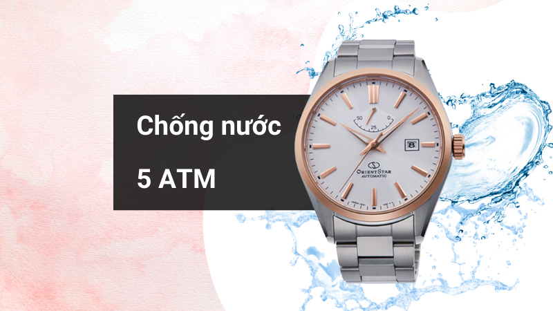 - Hệ số chống nước 5 ATM, giúp cho chiếc đồng hồ nam này an toàn khi tắm hay đi mưa, tuy nhiên không nên đeo đồng hồ khi bơi lội