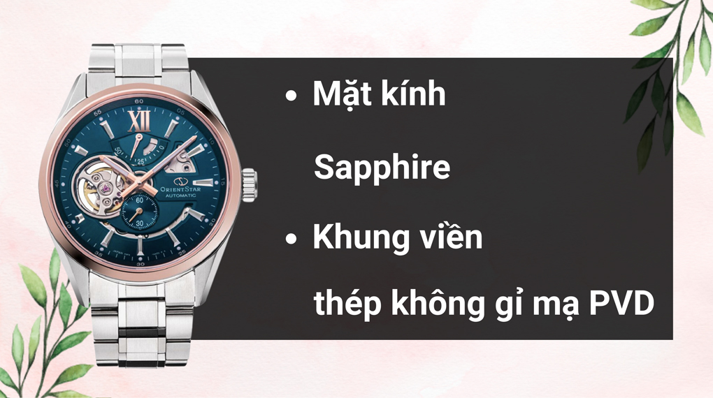 • Đồng hồ Orient với đường kính mặt là 41 mm. Ngoài ra, mặt kính của sản phẩm là kính Sapphire, có khả năng chống trầy và độ trong suốt tốt giúp bạn an tâm khi sử dụng.