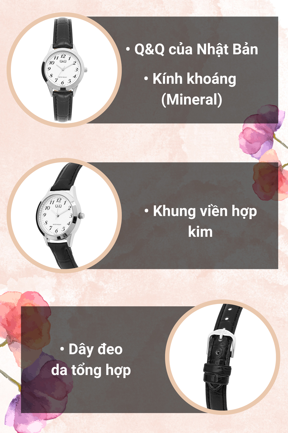 • Đồng hồ Q&Q có kích thước đường kính là 30 mm nhỏ vừa, sẽ giúp tôn lên đường nét cổ tay của nàng. Hơn nữa, mặt kính còn được trang bị chất liệu kính khoáng (Mineral) bền chắc, giúp nàng bảo vệ các chi tiết bên trong và khôi phục dễ dàng khi bị trầy nhẹ.