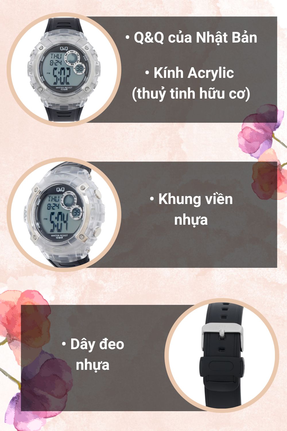 • Đồng hồ Q&Q này có đầy đủ tính năng hữu ích như báo thức, đồng hồ 24 giờ, bấm giờ thể thao, đèn nền, múi giờ thứ 2 hỗ trợ công việc hàng ngày Ngoài ra, tính năng bấm giờ đếm ngược tiện lợi, lịch ngày và thứ giúp bạn theo dõi thời gian trong ngày cùng với lịch tháng.