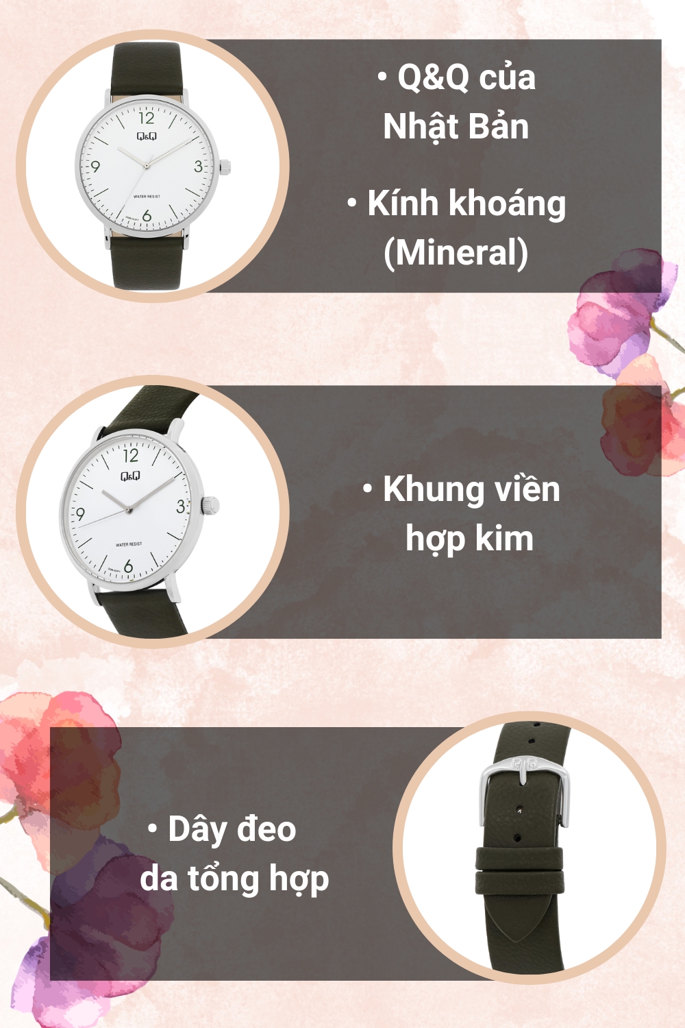 • Với đường kính mặt đồng hồ Q&Q là 40 mm phù hợp với bạn nam có cổ tay từ vừa đến lớn. Mặt kính của đồng hồ được làm bằng kính khoáng (Mineral), đảm bảo độ cứng và khả năng chịu lực khá, cùng với khả năng dễ dàng đánh bóng khi có trầy xước nhẹ.