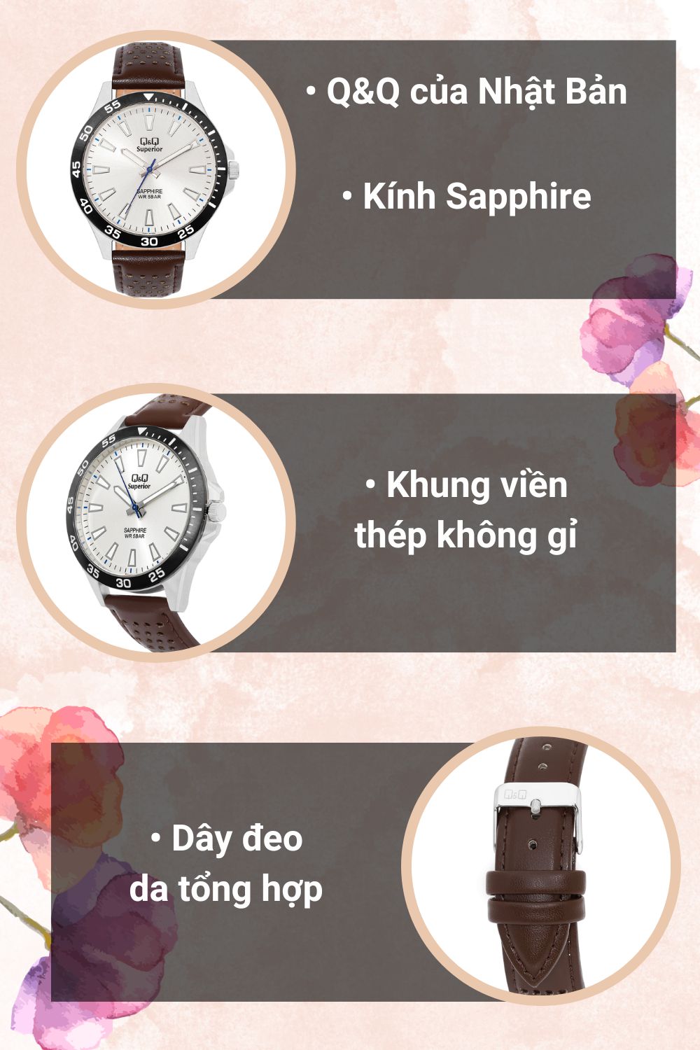 • Mẫu đồng hồ Q&Q này không chỉ phù hợp với những anh chàng có dáng người mảnh khảnh, mà còn là sự lựa chọn thông minh cho những bạn có đôi tay đầy đặn vì đường kính mặt của sản phẩm là 43 mm. Ngoài ra, hãng đã lựa chọn kính Sapphire làm chất liệu mặt kính nhờ có độ cứng, khả năng chịu va đập khá và độ trong suốt cao cho phép người dùng dễ dàng quan sát mặt đồng hồ.